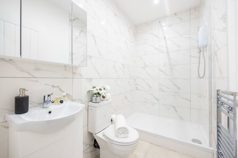Modern tiled bathroom suite with a walk in shower